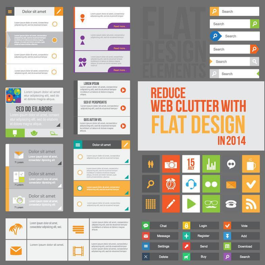 - С середины 2010-х всё быстрее набирает популярность flat design — отказ от сложных визуальных эффектов, теней, текстур, реалистичных объектов в пользу плоских форм, простых цветовых заливок и чёткой типографики.