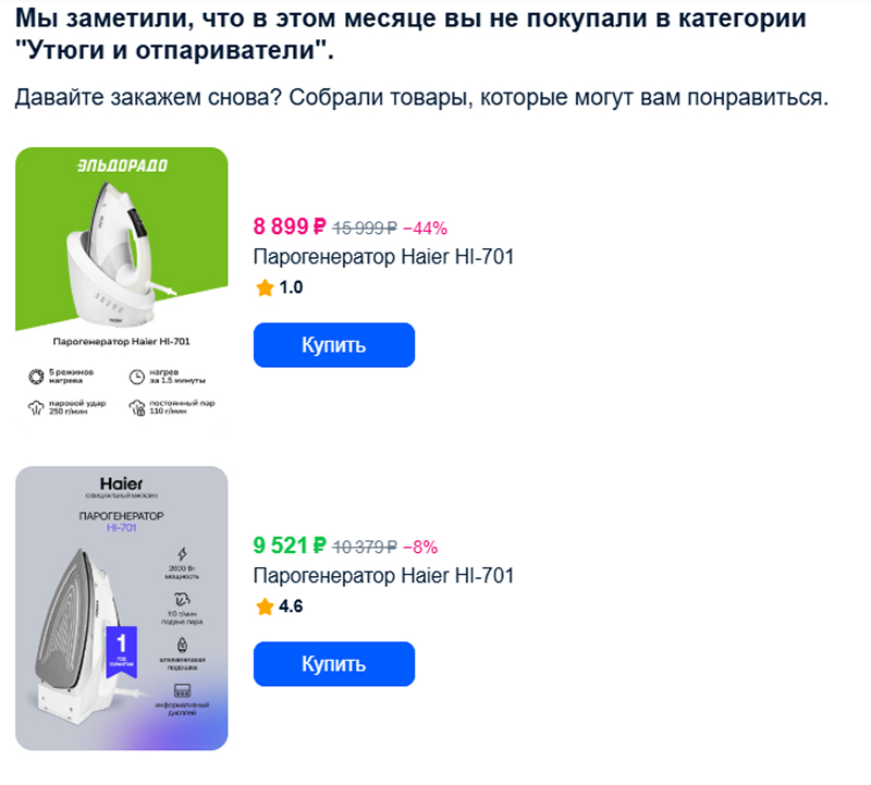 «В этом месяце вы не заказывали утюги и отпариватели. Купите утюг за 9000р.»